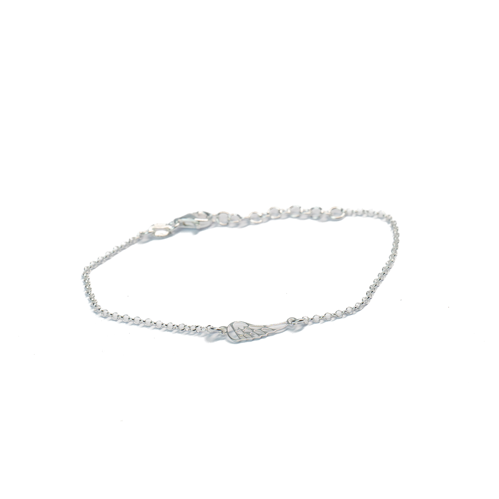 Sterling silver bracelet with an angel wing charm in the centre.